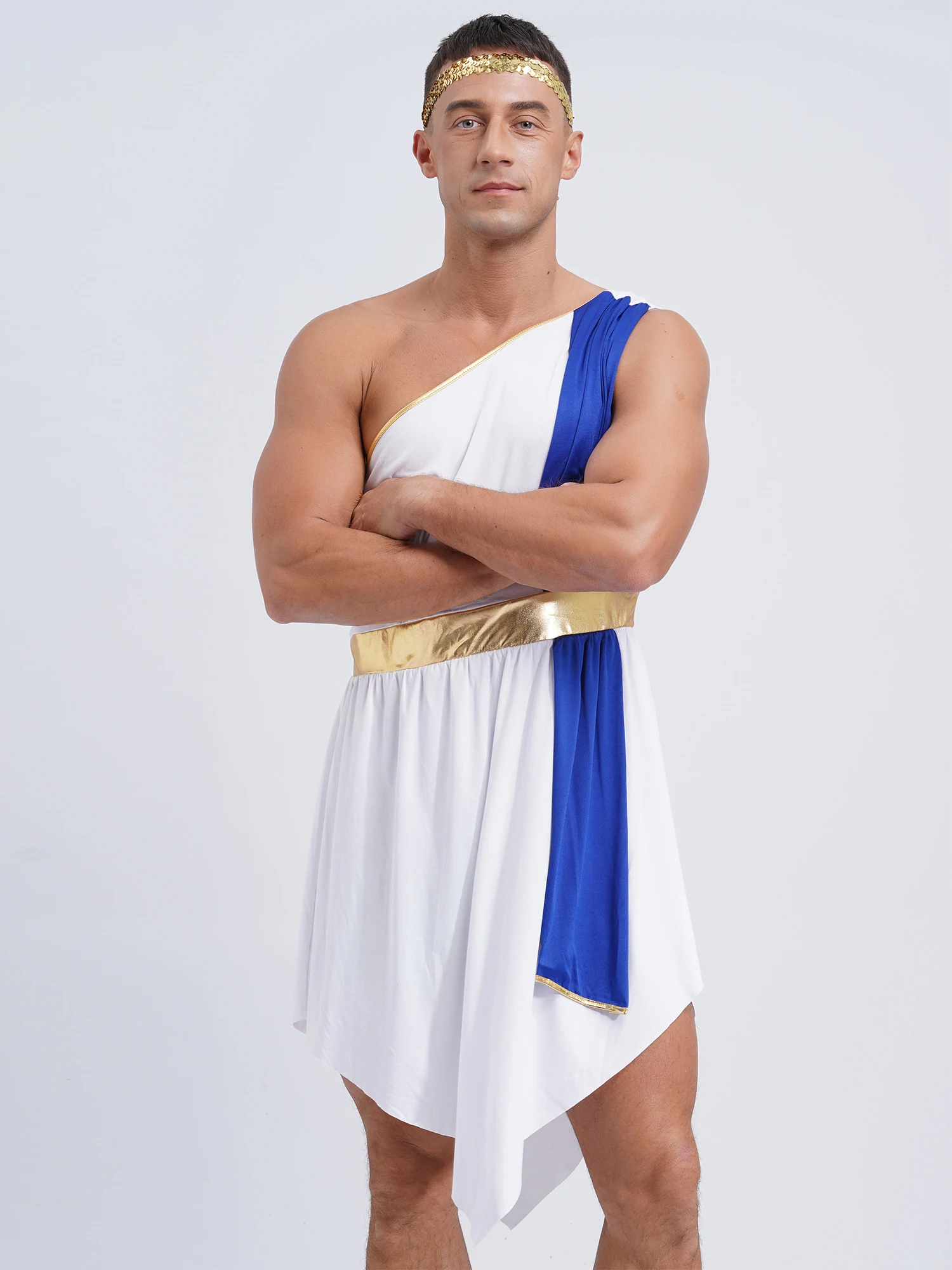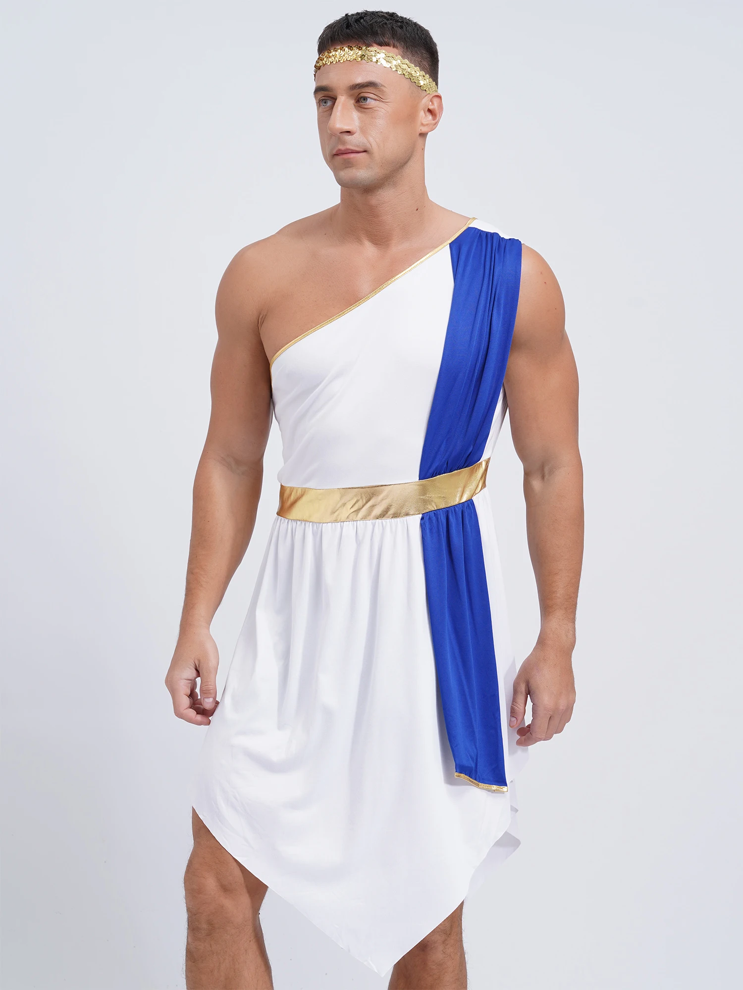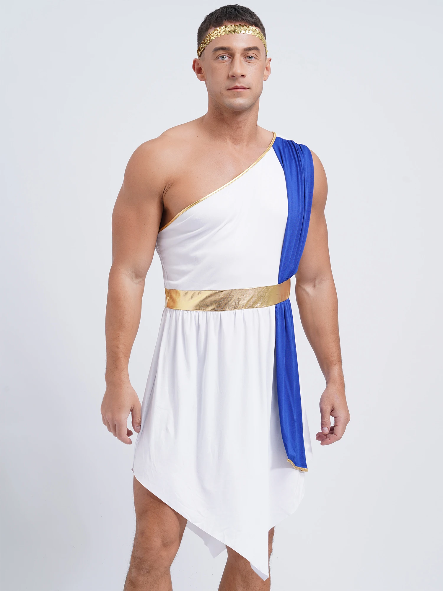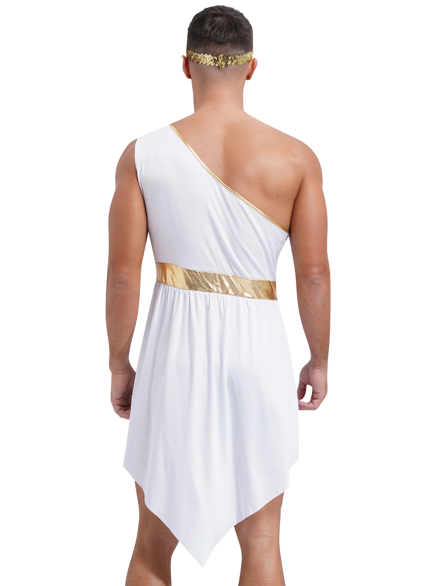 Disfraz masculino estilo romano y griego antiguo, tipo toga, con diseño asimétrico de un solo hombro y detalles de lentejuelas. Ideal para eventos de Halloween o representaciones históricas.