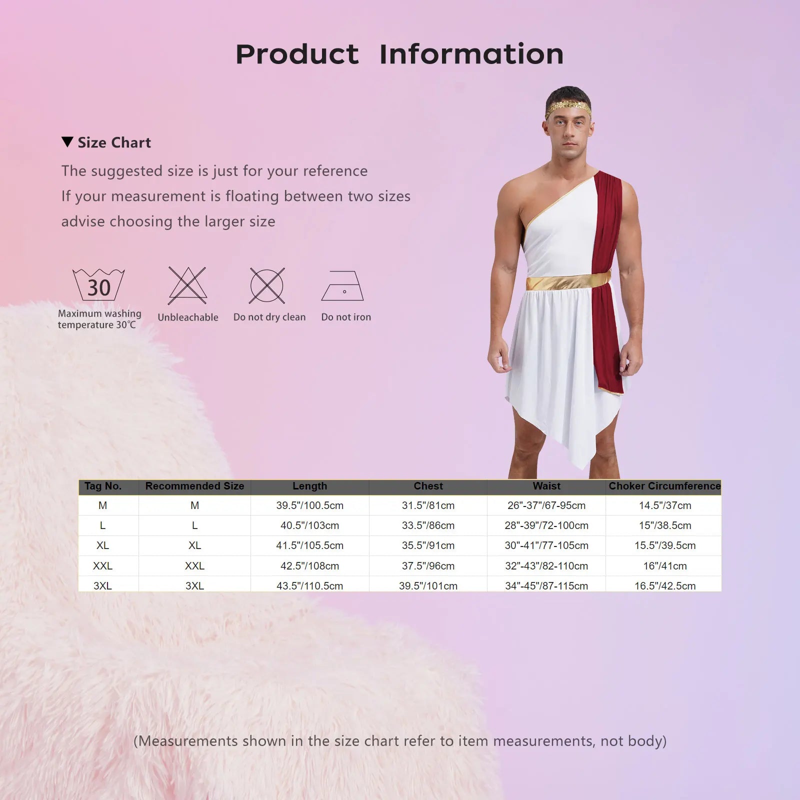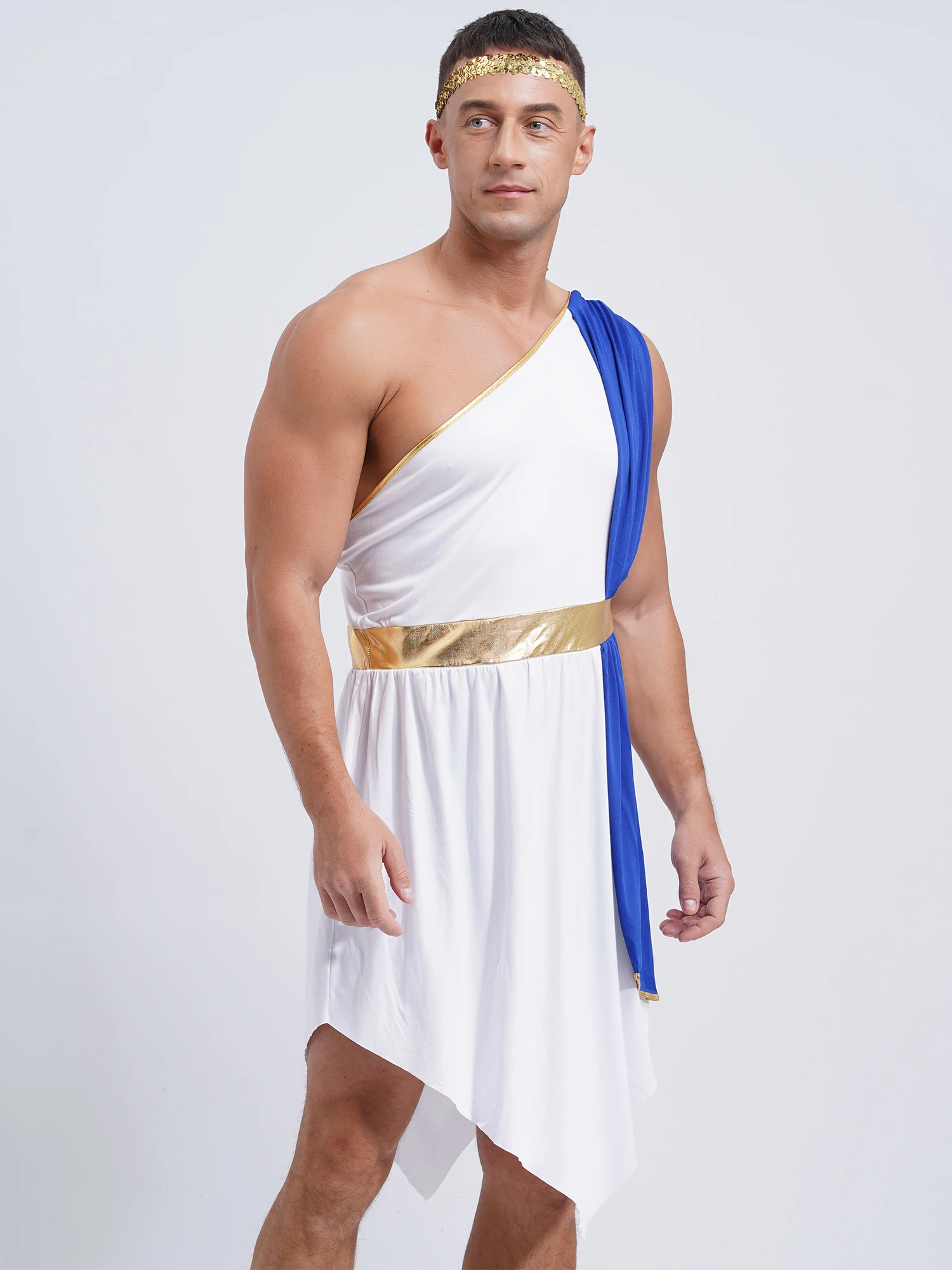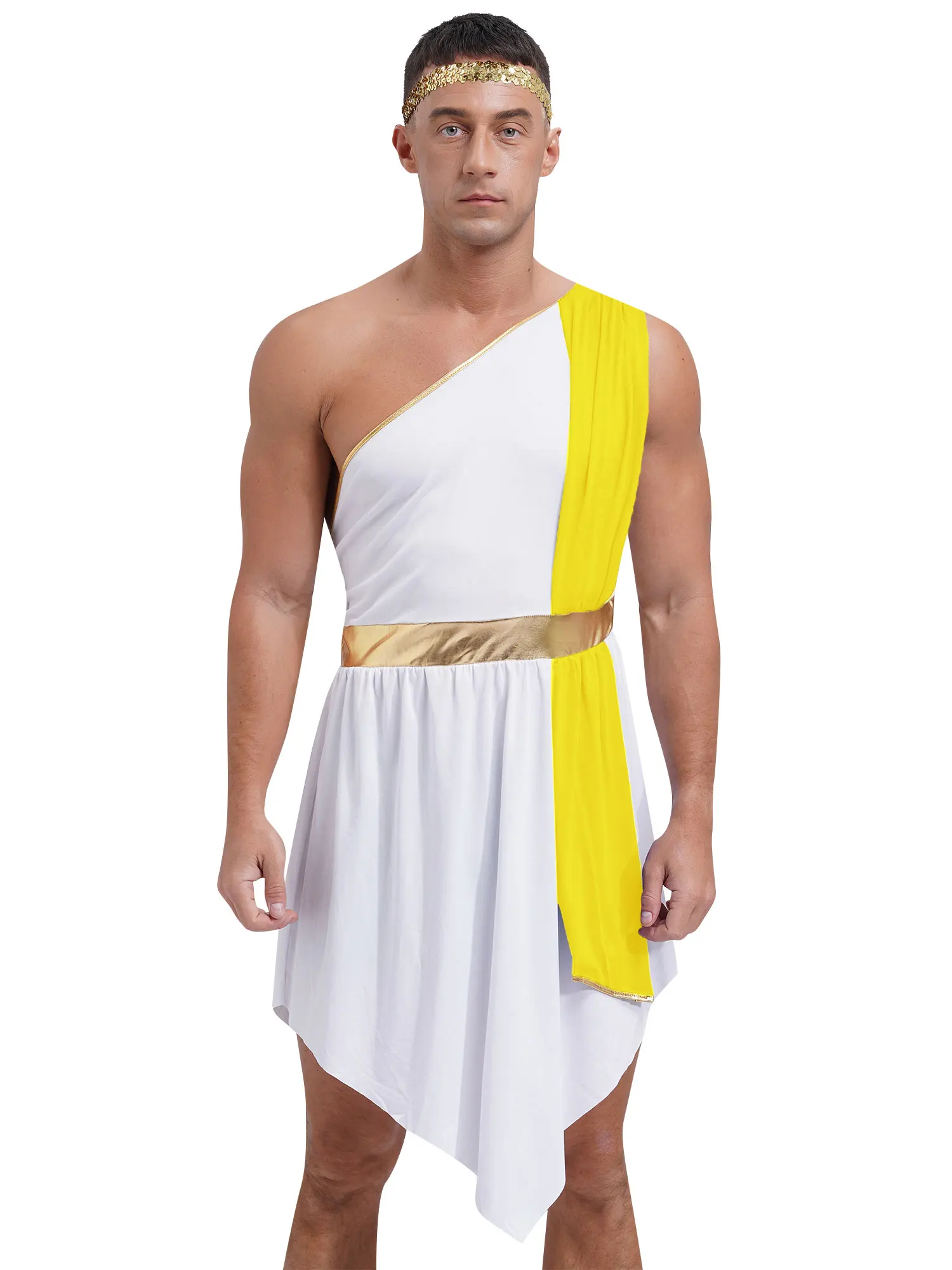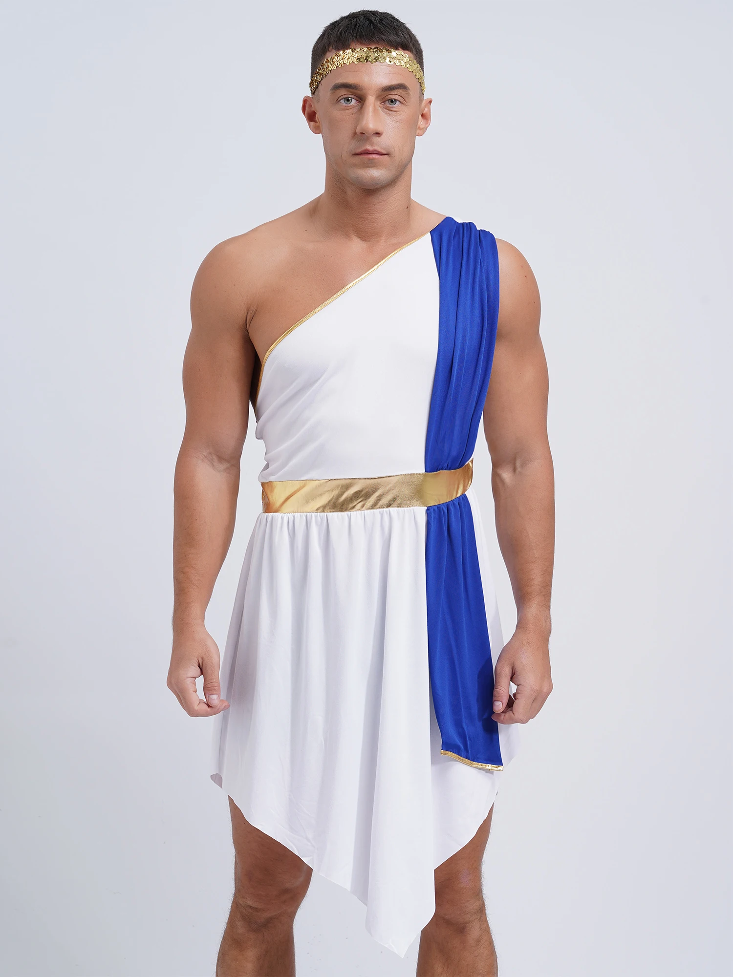 Disfraz masculino estilo romano y griego antiguo, tipo toga, con diseño asimétrico de un solo hombro y detalles de lentejuelas. Ideal para eventos de Halloween o representaciones históricas.