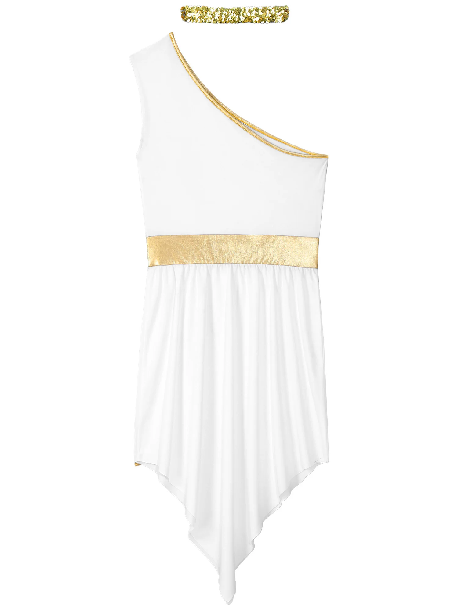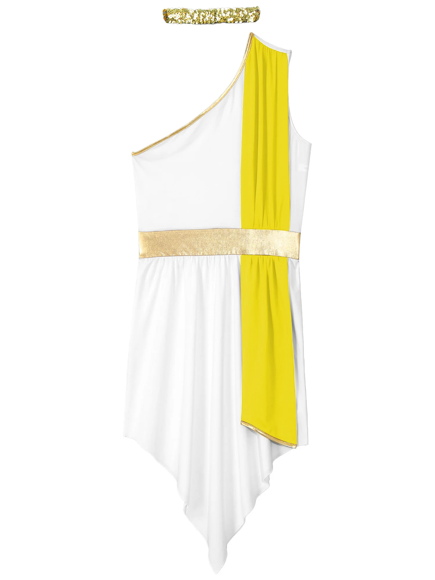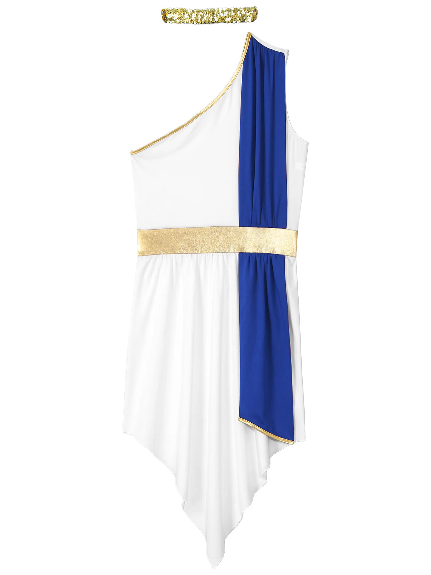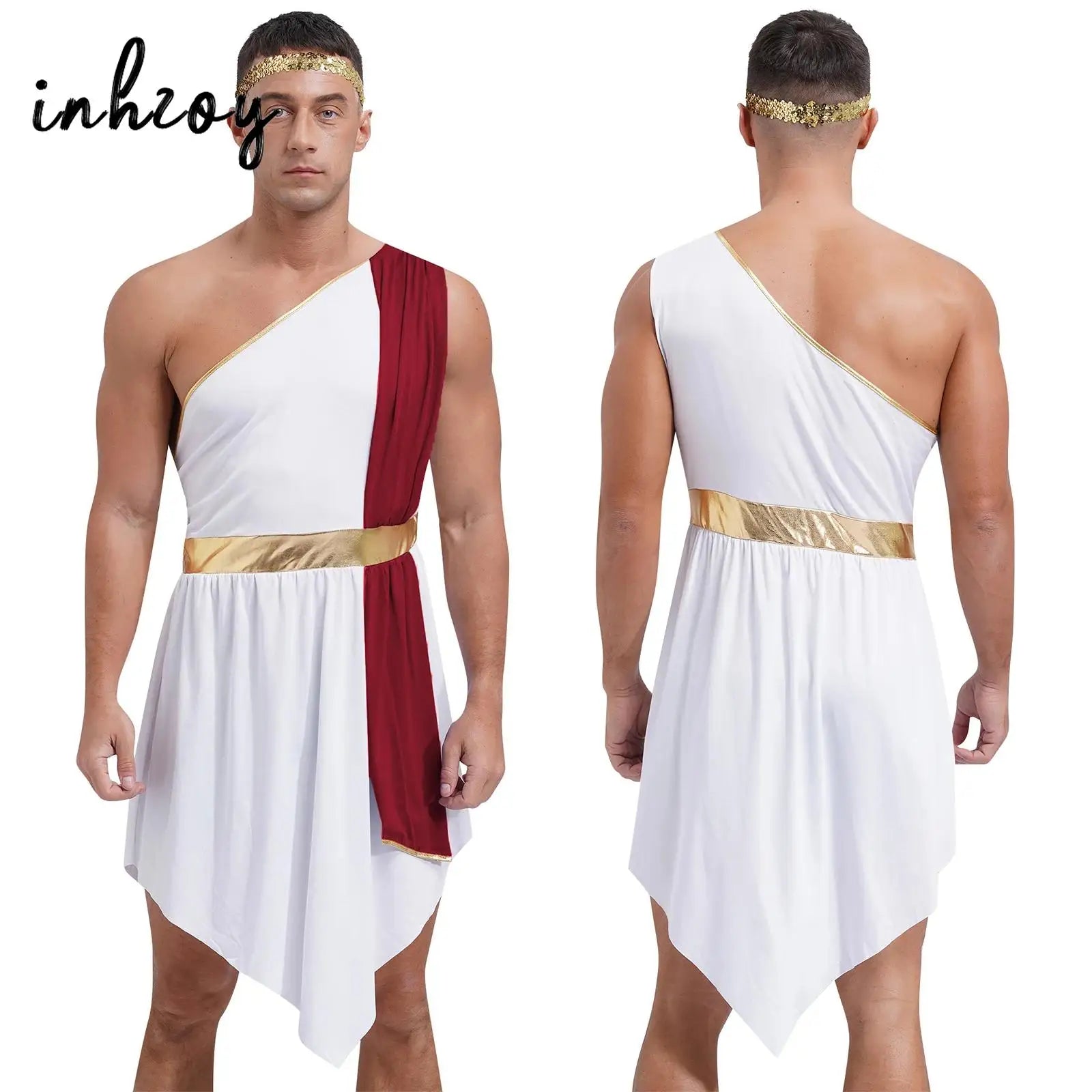 Disfraz masculino estilo romano y griego antiguo, tipo toga, con diseño asimétrico de un solo hombro y detalles de lentejuelas. Ideal para eventos de Halloween o representaciones históricas.